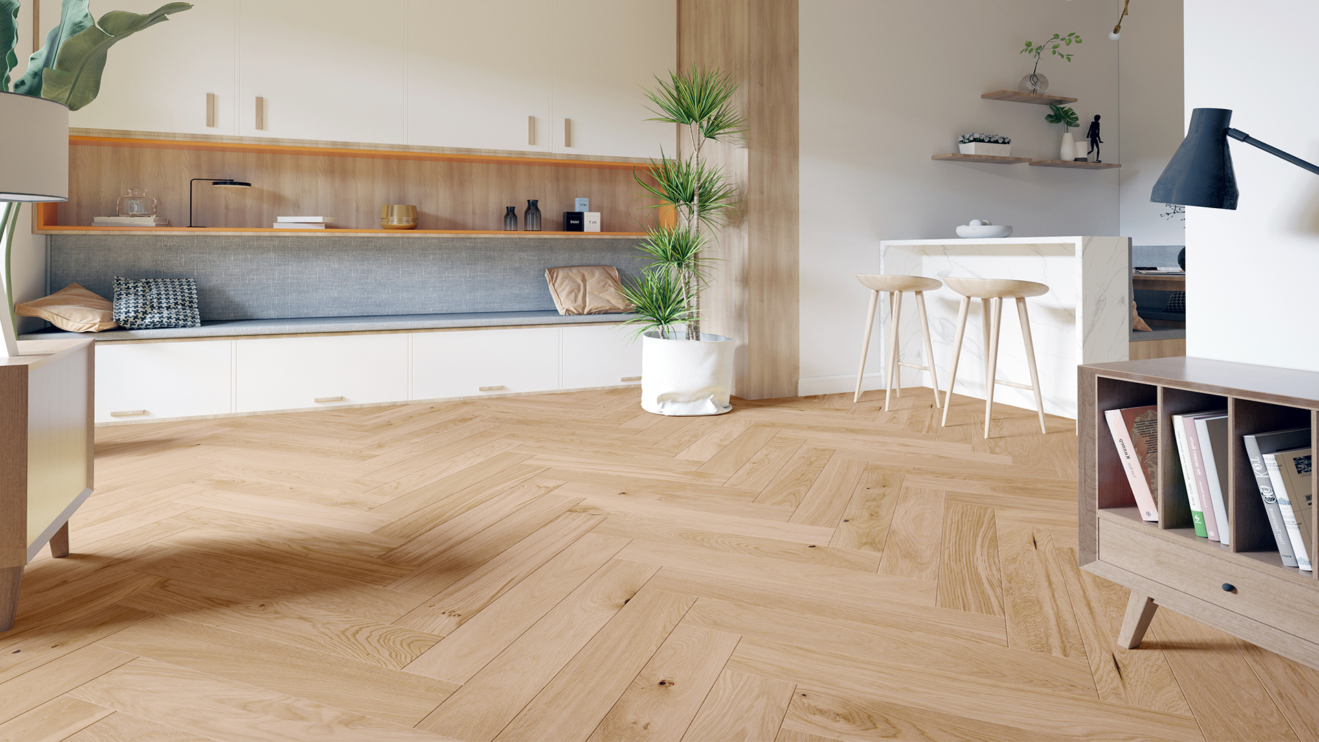 Structura lemnului este subliniată prin periere, iar marginile plăcilor de parchet sunt scoase în evidență cu ajutorul micro canelurilor.