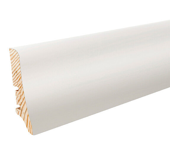 Plintă de pin cu folie albă. Este extrem de funcțională și stabilă dimensional. Se potrivește perfect cu orice tip de podea.