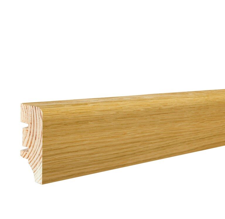 Plintă din lemn de pin stratificat îmbinat în dinți pentru a avea o stabilitate la lungime cu furnir de stejar lăcuit.