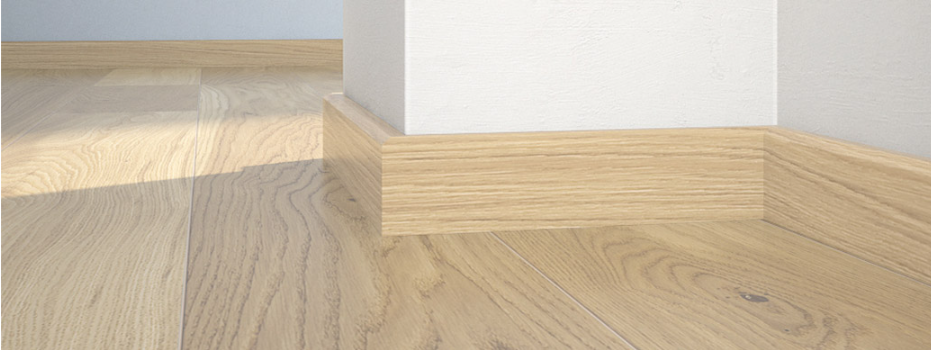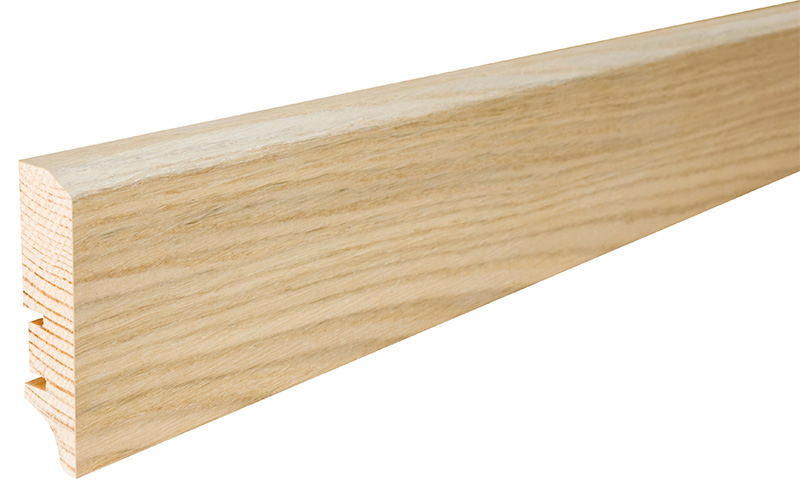 Plintă din lemn de pin  stratificat îmbinat în dinți pentru a avea o stabilitate la lungime cu furnir de stejar lacuită.