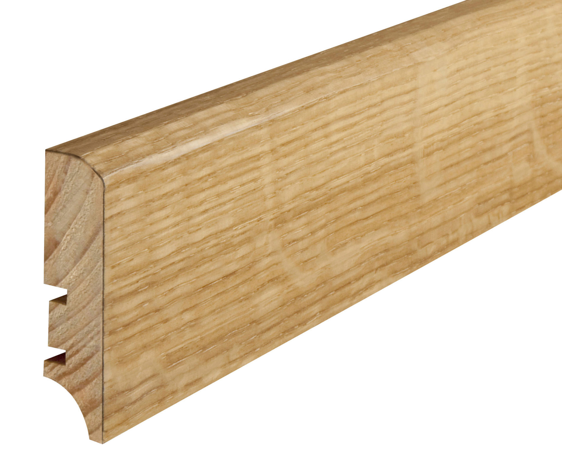 Plintă din lemn de pin stratificat îmbinat în dinți pentru a avea o stabilitate la lungime cu furnir de stejar lacuită.