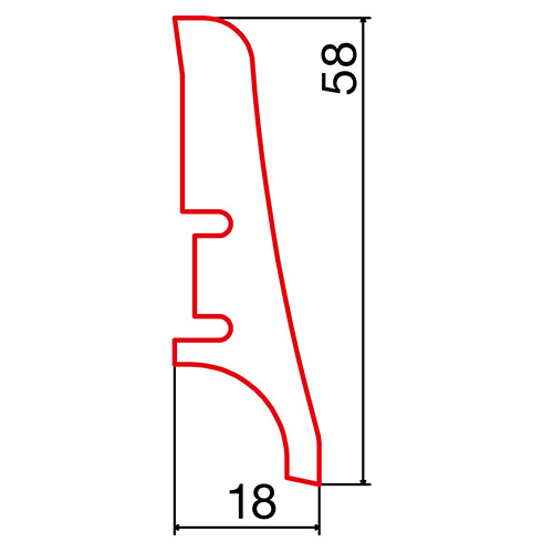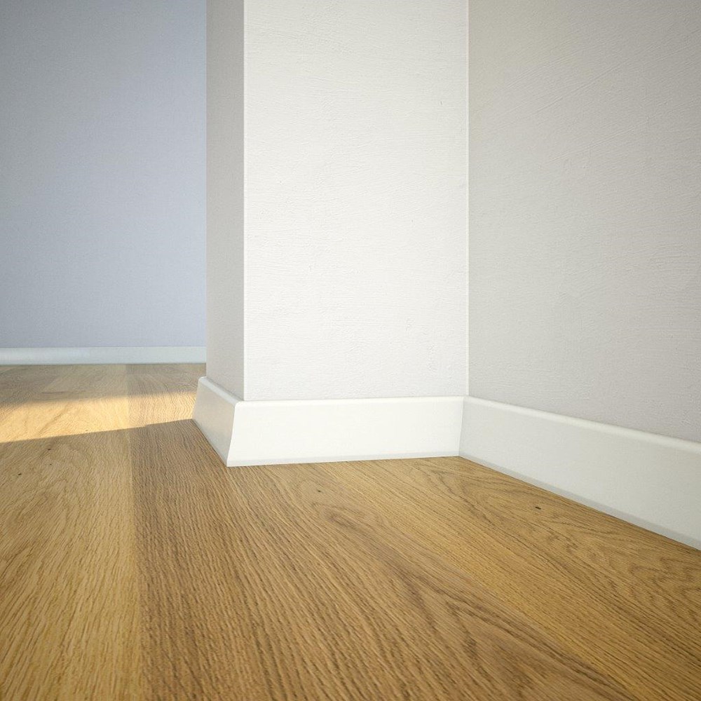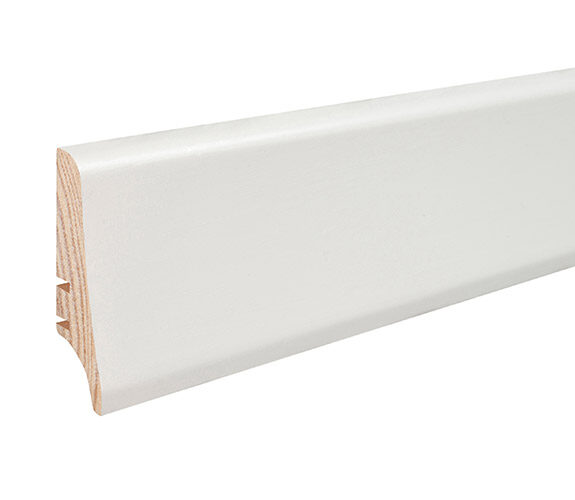 Plintă din lemn de pin stratificat îmbinat în dinți pentru a avea o stabilitate la lungime vopsită albă și lăcuită.