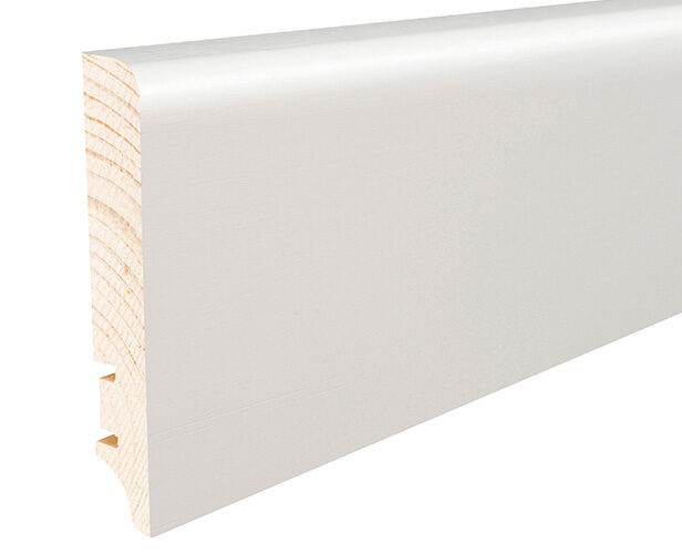 Plintă din lemn de pin stratificat îmbinat în dinți pentru a avea o stabilitate la lungime, este infoliata cu folie alba.