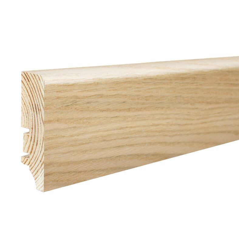 Plintă din lemn de pin stratificat îmbinat în dinți pentru a avea o stabilitate la lungime, este finisata cu furnir de stejar lăcuit.