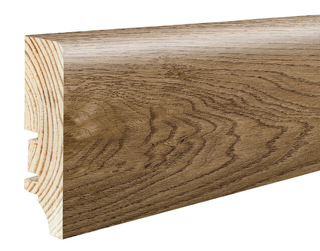Plintă de pin cu furnir de stejar lacuit. Este extrem de funcțională și stabilă dimensional. Se potrivește perfect cu orice tip de podea.