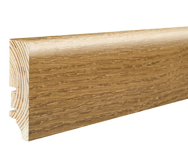 Plintă de pin cu furnir de stejar lacuit. Este extrem de funcțională și stabilă dimensional. Se potrivește perfect cu orice tip de podea.