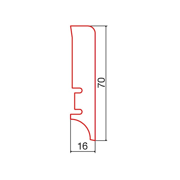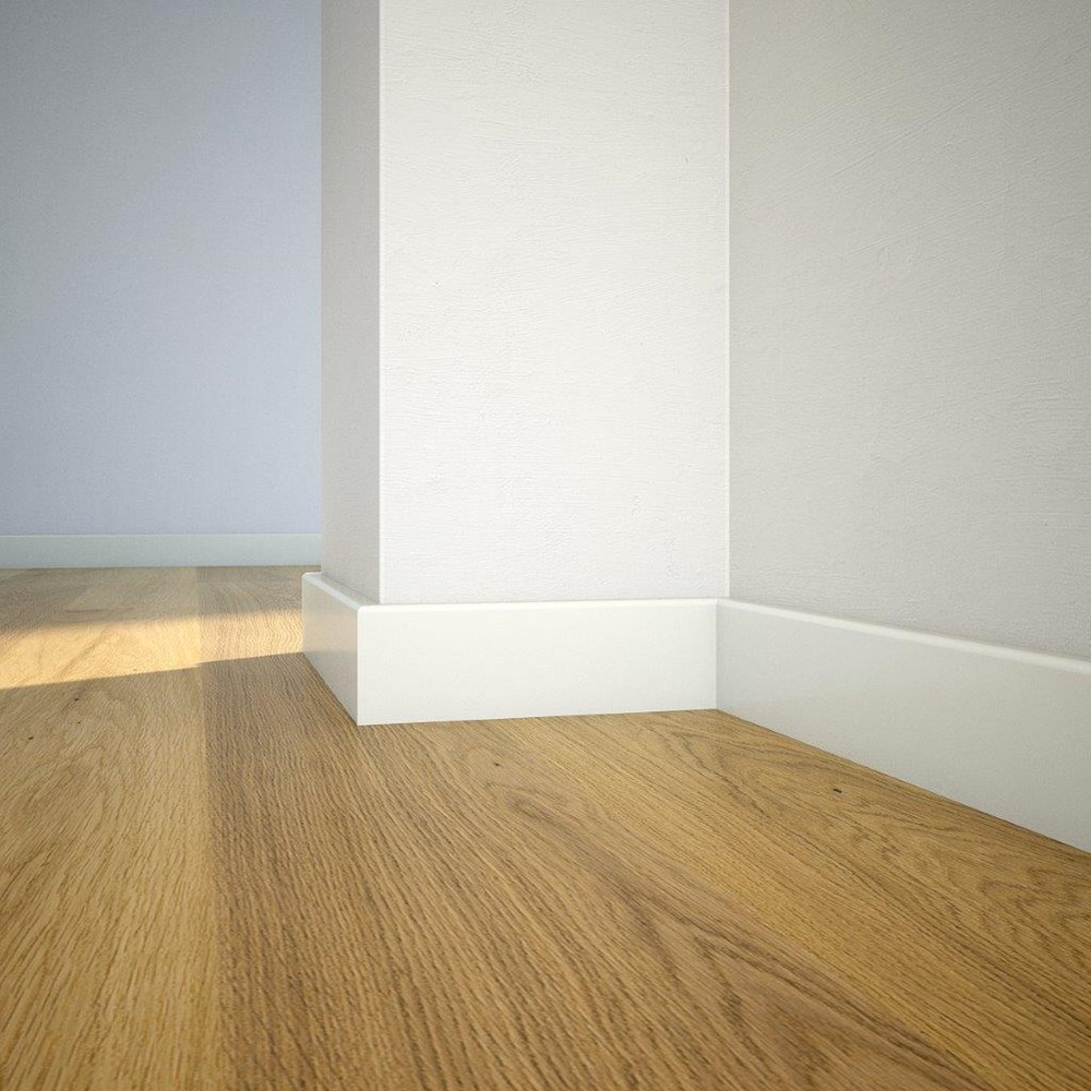 Plintă din lemn de pin stratificat îmbinat în dinți pentru a avea o stabilitate la lungime vopsită albă și lăcuită.