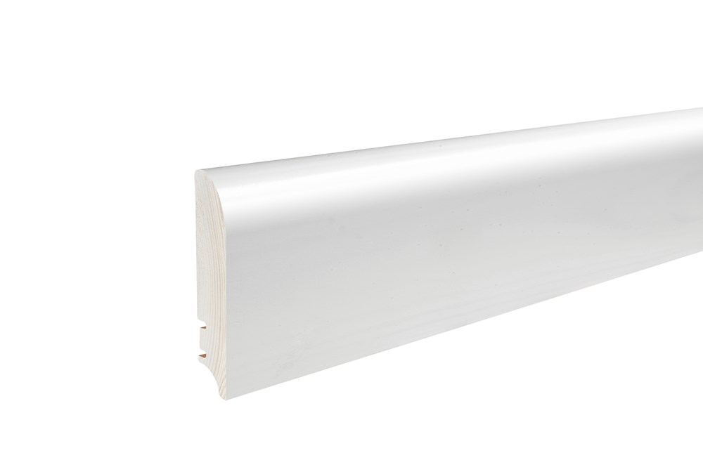 Plintă din lemn de pin stratificat îmbinat în dinți pentru a avea o stabilitate la lungime vopsită albă și lăcuită.