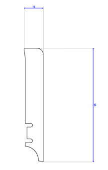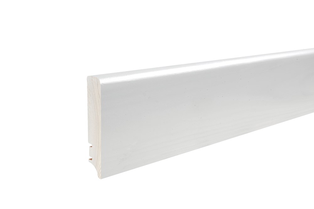 Plintă din lemn de pin  stratificat îmbinat în dinți pentru a avea o stabilitate la lungime vopsită albă și lăcuită.