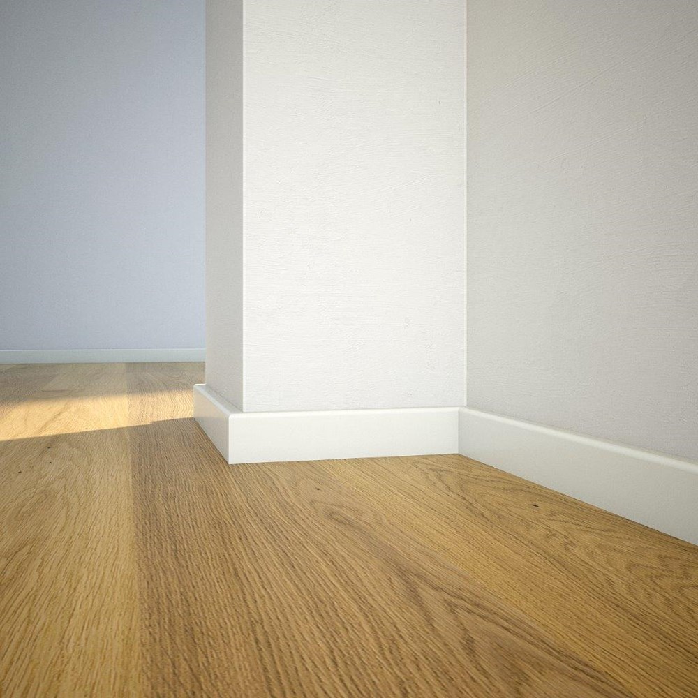 Plinte albe din lemn vopsite PW46 din lemn de pin stratificat îmbinat în dinți pentru a avea o stabilitate la lungime.